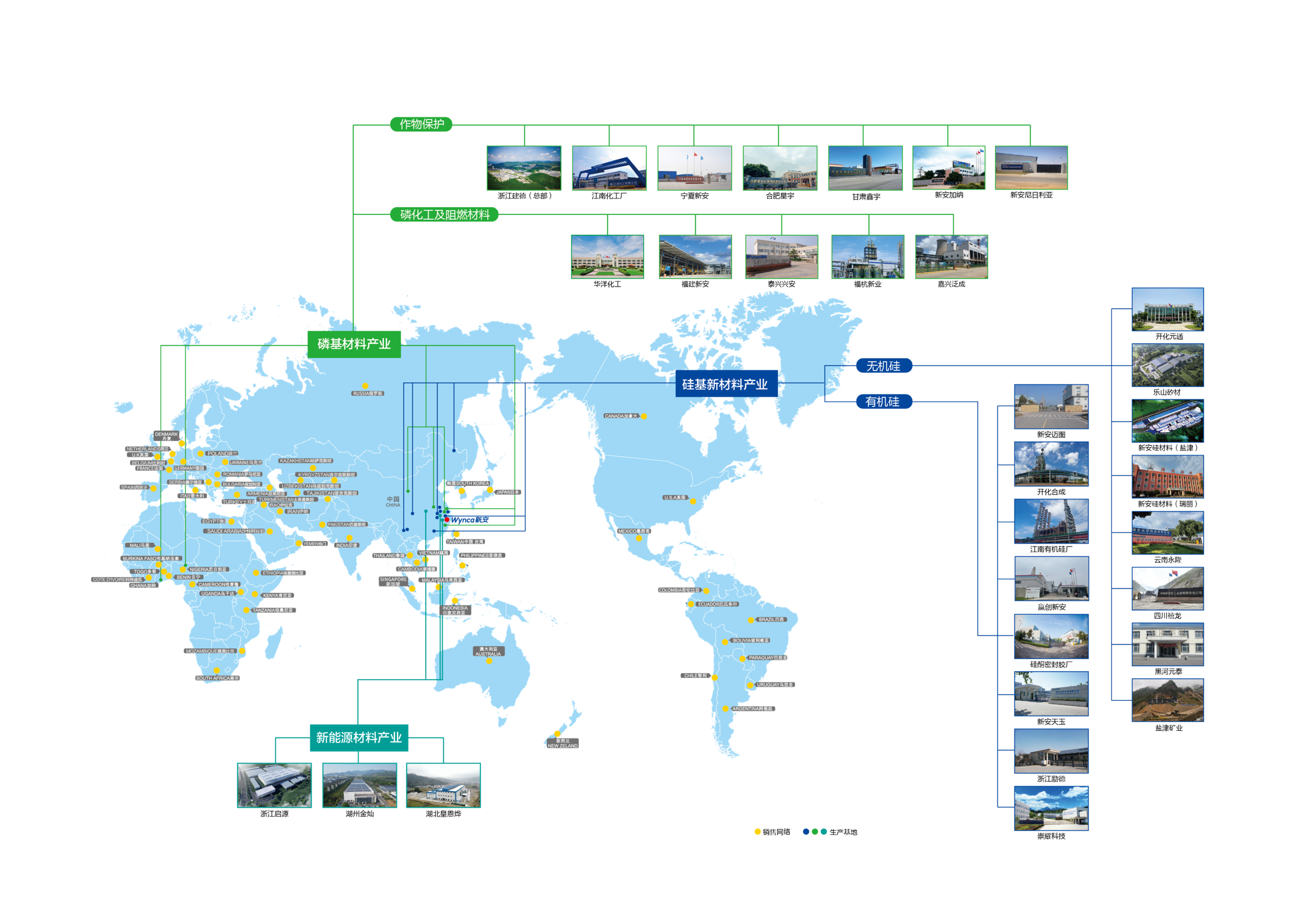 新安主营作物保护、硅基新材料、新能源材料三大产业,其中作物?;ば纬闪恕爸屑涮?原药-制剂”一体化发展模式,涵盖种子种苗、除草剂、杀虫剂、杀菌剂、作物营养等完整的作物保护体系,为保障粮食安全、助力增产增收提供植保综合解决方案;硅基新材料拥有从上游硅矿开采冶炼、有机硅单体合成、下游产品制造的完整产业链,产品广泛应用于电力通信、轨道交通与汽车、医疗健康、电子科技等领域,畅销全球130多个国家和地区;新能源材料基于“磷基、硅基”两大产业基础与优势,围绕新能源应用场景打造材料综合解决方案,构建“三足鼎立”的新发展格局。